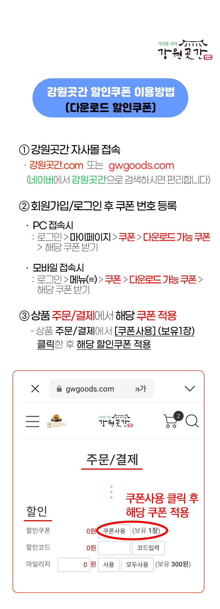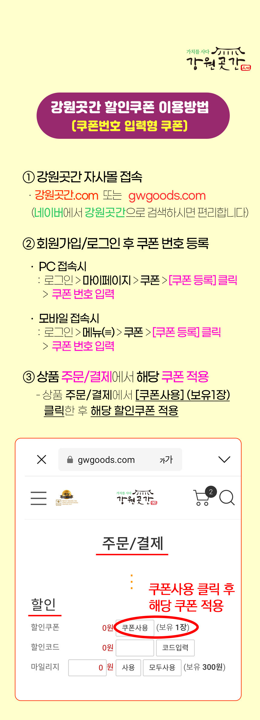 [이벤트/프로모션] 강원곳간 쿠폰을 받았는데 쿠폰 등록은 어떻게 하나요?